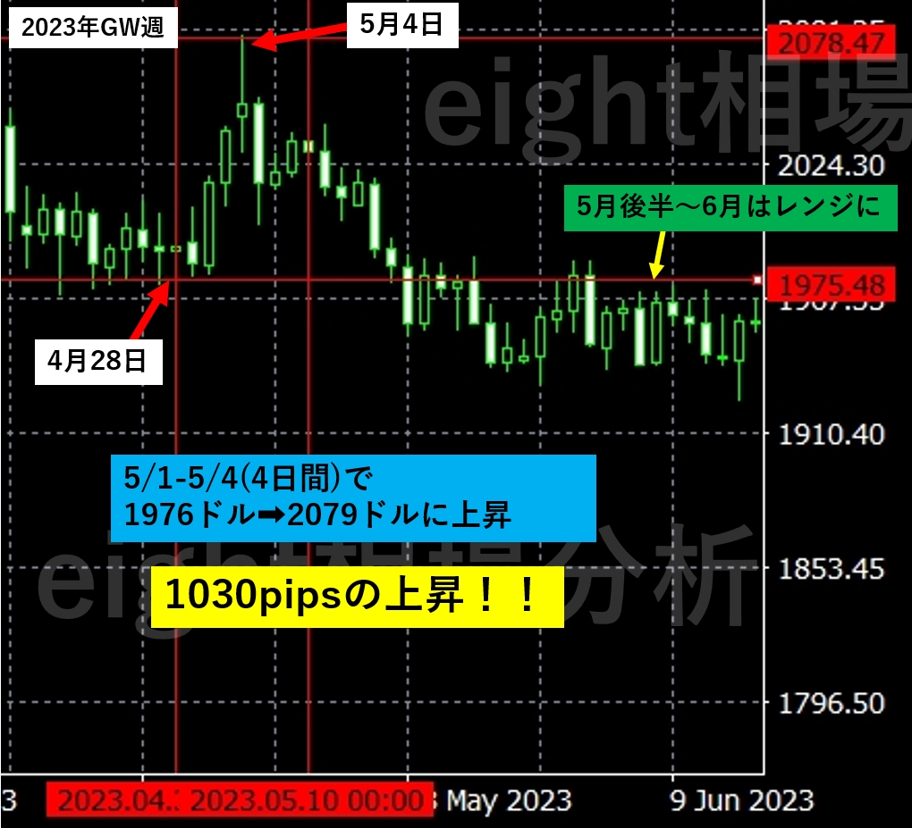 今年もちょうどこのタイミングで、4/29・5/2に日銀為替介入がありました。ドル円は急速に円高に傾き方向性が見えなくなっています。GOLDはそこまで影響は出ていませんが、相場が落ち着くまでもうしばらくかかりそうです。