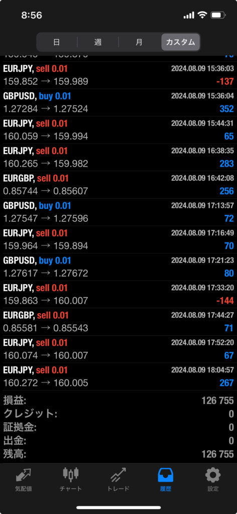 HULK EA 8/5~8/9 FX自動売買結果+126,755円 2024 8/10 運用結果 2024-08-10 ハルクは無料EAとしてプレゼントしています!ご希望の方は【ハルクEA希望】とメッセージ下さい! 怪物級の利益率ハルク!! ハルクの詳細ページ 無傷で利率680%達成!結果公開! 稼働条件 スタンダード口座:最低証拠金30万円 マイクロ口座:最低証拠金5万円 通貨ペアは複数通貨ペアを利用 FX業者はXM・IS6(EX口座可)・IronFX・HFMが使用可能。 目次ハルク 週間運用結果 結果 +126,755円 関連 運用結果 運用結果 よかったらシェアしてね! URLをコピーしました! URLをコピーしました! ETERNAL EA 7/29~8/2 FX自動売買結果 HULK EA改 8/5~8/9 FX自動売買結果+39,009円 関連記事 BOLTS EA 1/26~1/30 FX自動売買結果+212円 2026-01-31 FRIDAY EA 1/26~1/30 FX自動売買結果+1,538円 2026-01-31 SHIELD EA 1/26~1/30 FX自動売買結果+210,444円 2026-01-31 ETERNAL EA 1/26~1/30 FX自動売買結果+474,591円 2026-01-31 SWORD EA 1/26~1/30 FX自動売買結果+341,560円 2026-01-31 STAR EA 1/26~1/30 FX自動売買結果+329,665円 2026-01-31 朝活トレード!Buster EA 1/26~1/30 FX自動売買結果 2026-01-31 Guardian NEO 1/26~1/30 FX自動売買結果+101,661円 2026-01-31