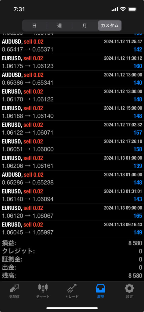 HULK改 EA 11/11~11/15 FX自動売買結果+8,580円 2024 11/16 運用結果 2024-11-16 ハルク改は無料EAとしてプレゼントしています!ご希望の方は【ハルク改EA希望】とメッセージ下さい! 怪物級の安定感ハルク改!! ハルク改の詳細ページ 未だに破綻ナシ 2年以上無敗!HULK改 EA! 稼働条件 スタンダード口座専用EA 最低証拠金25万円 通貨ペアは複数通貨ペアを利用 FX業者はXM・IS6(EX口座可)・IronFX・HFMが使用可能。 目次ハルク改 週間運用結果 結果 +8,580円 ハルク改の詳細ページ 関連 運用結果 運用結果 よかったらシェアしてね! URLをコピーしました! URLをコピーしました! INFINITY EA 11/4~11/8 FX自動売買結果+436,603円 THOR EA 11/11~11/15 FX自動売買結果+9,971円 関連記事 BOLTS EA 1/26~1/30 FX自動売買結果+212円 2026-01-31 FRIDAY EA 1/26~1/30 FX自動売買結果+1,538円 2026-01-31 SHIELD EA 1/26~1/30 FX自動売買結果+210,444円 2026-01-31 ETERNAL EA 1/26~1/30 FX自動売買結果+474,591円 2026-01-31 SWORD EA 1/26~1/30 FX自動売買結果+341,560円 2026-01-31 STAR EA 1/26~1/30 FX自動売買結果+329,665円 2026-01-31 朝活トレード!Buster EA 1/26~1/30 FX自動売買結果 2026-01-31 Guardian NEO 1/26~1/30 FX自動売買結果+101,661円 2026-01-31