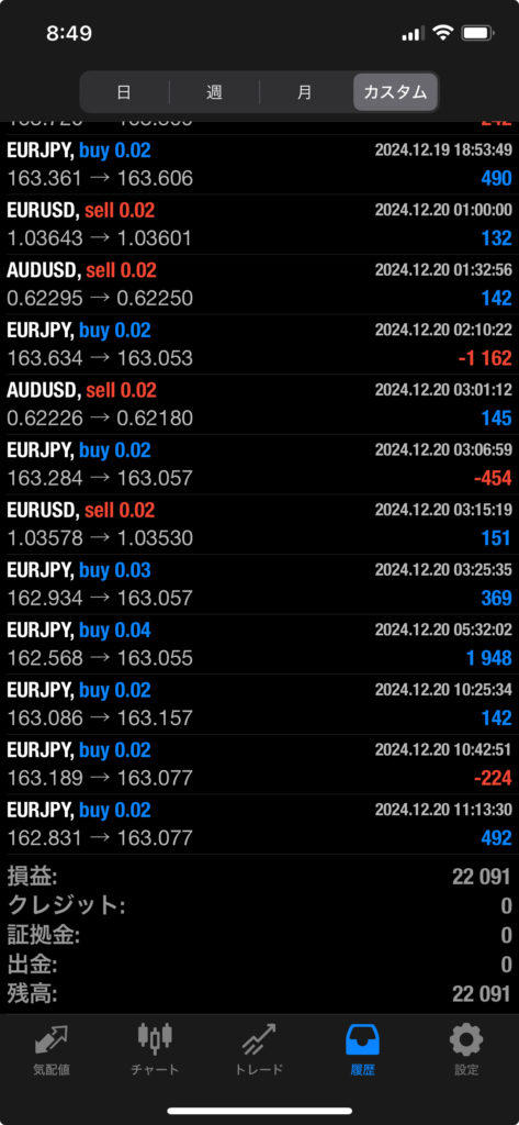 HULK改 EA 12/16~12/20 FX自動売買結果+22,091円 2024 12/21 運用結果 2024-12-21 ハルク改は無料EAとしてプレゼントしています!ご希望の方は【ハルク改EA希望】とメッセージ下さい! 怪物級の安定感ハルク改!! ハルク改の詳細ページ 未だに破綻ナシ 2年以上無敗!HULK改 EA! 稼働条件 スタンダード口座専用EA 最低証拠金25万円 通貨ペアは複数通貨ペアを利用 FX業者はXM・IS6(EX口座可)・IronFX・HFMが使用可能。 目次ハルク改 週間運用結果 結果 +22,091円 ハルク改の詳細ページ 関連 運用結果 運用結果 よかったらシェアしてね! URLをコピーしました! URLをコピーしました! INFINITY EA 12/9~12/13 FX自動売買結果+322,819円 THOR EA 12/16~12/20 FX自動売買結果+12,371円 関連記事 BOLTS EA 1/26~1/30 FX自動売買結果+212円 2026-01-31 FRIDAY EA 1/26~1/30 FX自動売買結果+1,538円 2026-01-31 SHIELD EA 1/26~1/30 FX自動売買結果+210,444円 2026-01-31 ETERNAL EA 1/26~1/30 FX自動売買結果+474,591円 2026-01-31 SWORD EA 1/26~1/30 FX自動売買結果+341,560円 2026-01-31 STAR EA 1/26~1/30 FX自動売買結果+329,665円 2026-01-31 朝活トレード!Buster EA 1/26~1/30 FX自動売買結果 2026-01-31 Guardian NEO 1/26~1/30 FX自動売買結果+101,661円 2026-01-31