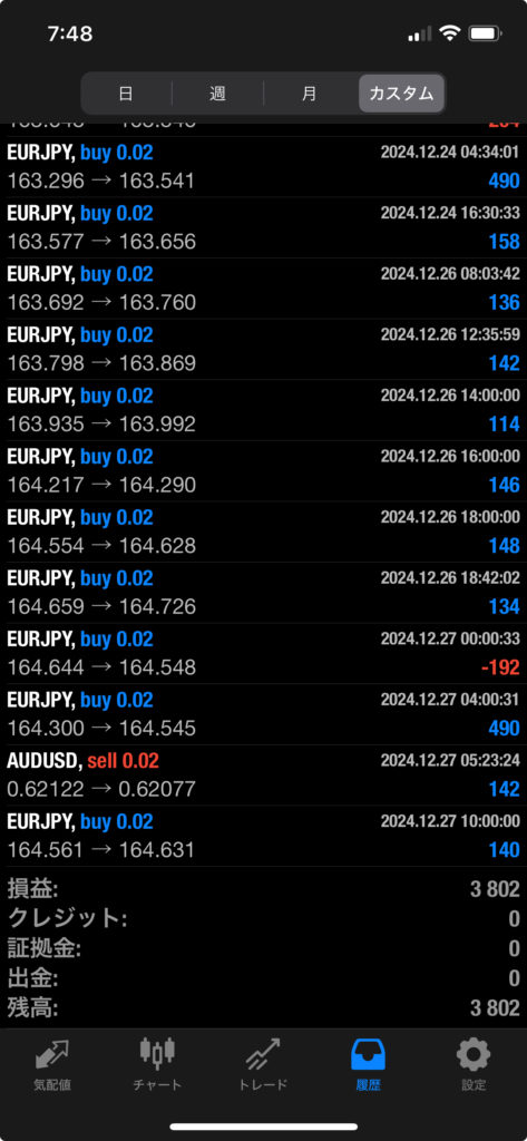 HULK改 EA 12/23~12/27 FX自動売買結果+3,802円 2024 12/28 運用結果 2024-12-28 ハルク改は無料EAとしてプレゼントしています!ご希望の方は【ハルク改EA希望】とメッセージ下さい! 怪物級の安定感ハルク改!! ハルク改の詳細ページ 未だに破綻ナシ 2年以上無敗!HULK改 EA! 稼働条件 スタンダード口座専用EA 最低証拠金25万円 通貨ペアは複数通貨ペアを利用 FX業者はXM・IS6(EX口座可)・IronFX・HFMが使用可能。 目次ハルク改 週間運用結果 結果 +3,802円 ハルク改の詳細ページ 関連 運用結果 運用結果 よかったらシェアしてね! URLをコピーしました! URLをコピーしました! INFINITY EA 12/16~12/20 FX自動売買結果+432,782円 THOR EA 12/23~12/27 FX自動売買結果+5,381円 関連記事 BOLTS EA 1/26~1/30 FX自動売買結果+212円 2026-01-31 FRIDAY EA 1/26~1/30 FX自動売買結果+1,538円 2026-01-31 SHIELD EA 1/26~1/30 FX自動売買結果+210,444円 2026-01-31 ETERNAL EA 1/26~1/30 FX自動売買結果+474,591円 2026-01-31 SWORD EA 1/26~1/30 FX自動売買結果+341,560円 2026-01-31 STAR EA 1/26~1/30 FX自動売買結果+329,665円 2026-01-31 朝活トレード!Buster EA 1/26~1/30 FX自動売買結果 2026-01-31 Guardian NEO 1/26~1/30 FX自動売買結果+101,661円 2026-01-31