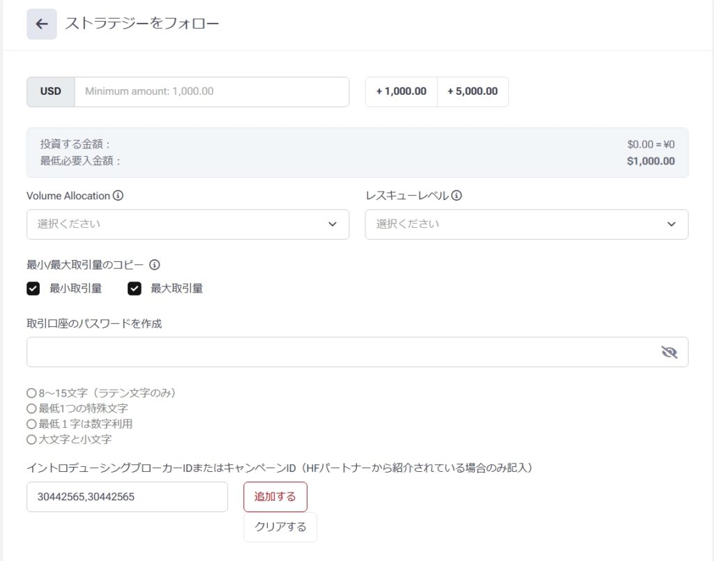 口座への毎入金、あるいはその口座からの毎出金時にVolume Allocation・レスキューレベル・最小/最大取引数量のコピーなどの変更が可能になっております。(HFMサポートに確認済)