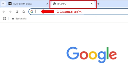 マイページにログインしている同じブラウザの新しいタブを開き以下のURLをアドレスバーに貼り付けてアクセスします。※例)chromeでHFMにログイン済であれば同じchromeの新規ページでURLへアクセス
