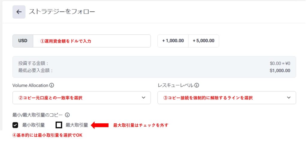 今回ご参加いただくコピトレはコピー元口座は常に1000ドルになるように調整している為、あなたの口座に1,000USD以上が常にあると考えた場合、「最小取引量」のみにチェックしておけばOKです。