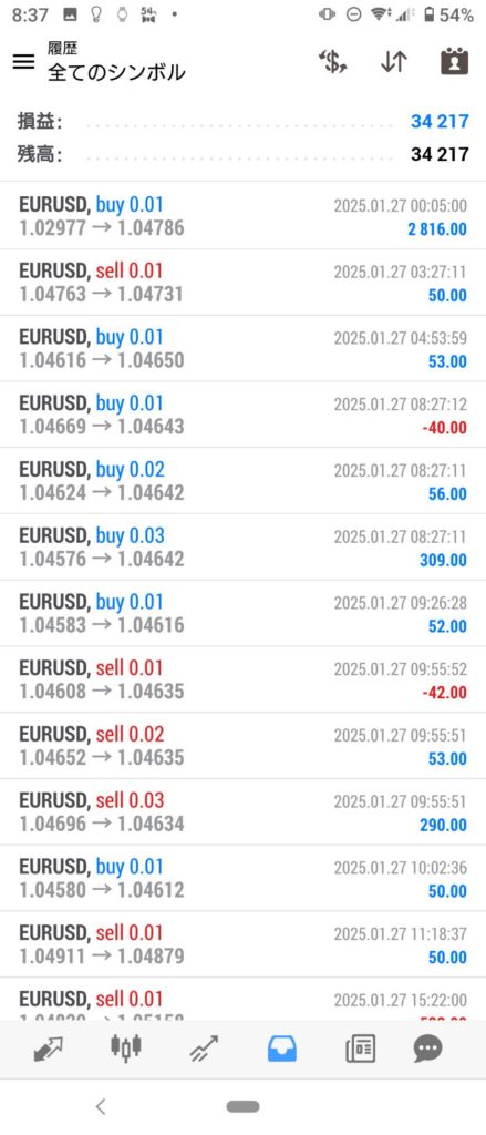 THOR EA 1/27~1/31 FX自動売買結果+34,217円 2025 2/01 運用結果 2025-02-01 ソーは無料EAとしてプレゼントしています!ご希望の方は【ソーEA希望】とメッセージ下さい! THOR EAの詳細ページ 稼働条件 スタンダード口座版:最低証拠金25万円 マイクロ口座版:証拠金5万円 THORは通貨ペアEURUSDのみ FX業者はXM・IS6(EX口座可)・IronFX・HFMを使用します。 目次THOR EA 週間利益結果 結果 +34,217円 関連 運用結果 運用結果 よかったらシェアしてね! URLをコピーしました! URLをコピーしました! HULK改 EA 1/27~1/31 FX自動売買結果+36,572円 THOR Limit EA 1/27~1/31 FX自動売買結果+26,535円 関連記事 BOLTS EA 1/26~1/30 FX自動売買結果+212円 2026-01-31 FRIDAY EA 1/26~1/30 FX自動売買結果+1,538円 2026-01-31 SHIELD EA 1/26~1/30 FX自動売買結果+210,444円 2026-01-31 ETERNAL EA 1/26~1/30 FX自動売買結果+474,591円 2026-01-31 SWORD EA 1/26~1/30 FX自動売買結果+341,560円 2026-01-31 STAR EA 1/26~1/30 FX自動売買結果+329,665円 2026-01-31 朝活トレード!Buster EA 1/26~1/30 FX自動売買結果 2026-01-31 Guardian NEO 1/26~1/30 FX自動売買結果+101,661円 2026-01-31