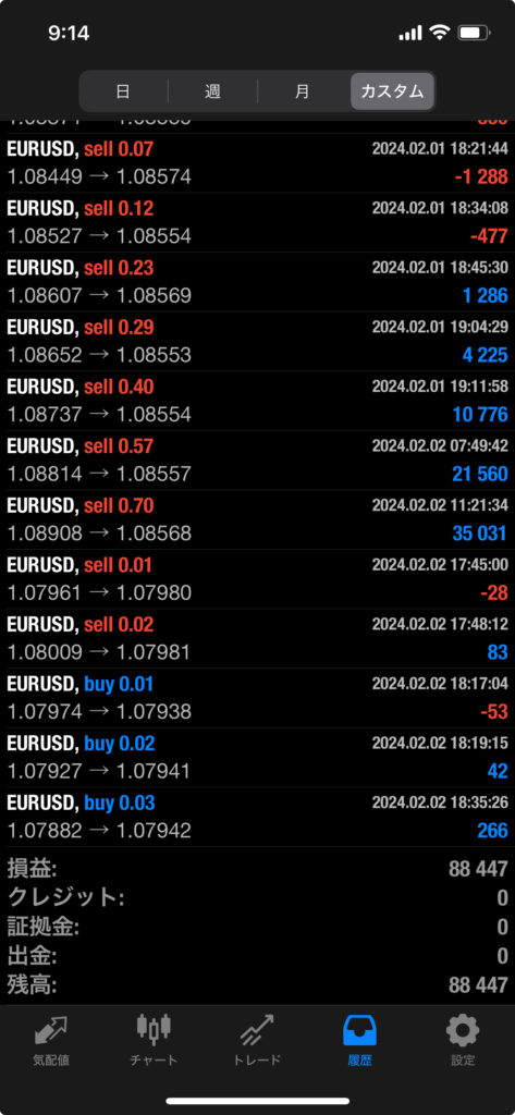 THOR EA 1/29~2/2 FX自動売買結果+88,447円 2024 2/03 運用結果 2024-02-03 ソーは無料EAとしてプレゼントしています!ご希望の方は【ソーEA希望】とメッセージ下さい! THOR EAの詳細ページ 稼働条件 スタンダード口座版:最低証拠金25万円 マイクロ口座版:証拠金5万円 THORは通貨ペアEURUSDのみ FX業者はXM・IS6(EX口座可)・IronFX・HFMを使用します。 目次THOR EA 週間利益結果 結果 +88,447円 関連 運用結果 運用結果 よかったらシェアしてね! URLをコピーしました! URLをコピーしました! HULK EA改 1/29~2/2 FX自動売買結果+11,461円 THOR Limit EA 1/29~2/2 FX自動売買結果+17,125円 関連記事 BOLTS EA 1/26~1/30 FX自動売買結果+212円 2026-01-31 FRIDAY EA 1/26~1/30 FX自動売買結果+1,538円 2026-01-31 SHIELD EA 1/26~1/30 FX自動売買結果+210,444円 2026-01-31 ETERNAL EA 1/26~1/30 FX自動売買結果+474,591円 2026-01-31 SWORD EA 1/26~1/30 FX自動売買結果+341,560円 2026-01-31 STAR EA 1/26~1/30 FX自動売買結果+329,665円 2026-01-31 朝活トレード!Buster EA 1/26~1/30 FX自動売買結果 2026-01-31 Guardian NEO 1/26~1/30 FX自動売買結果+101,661円 2026-01-31