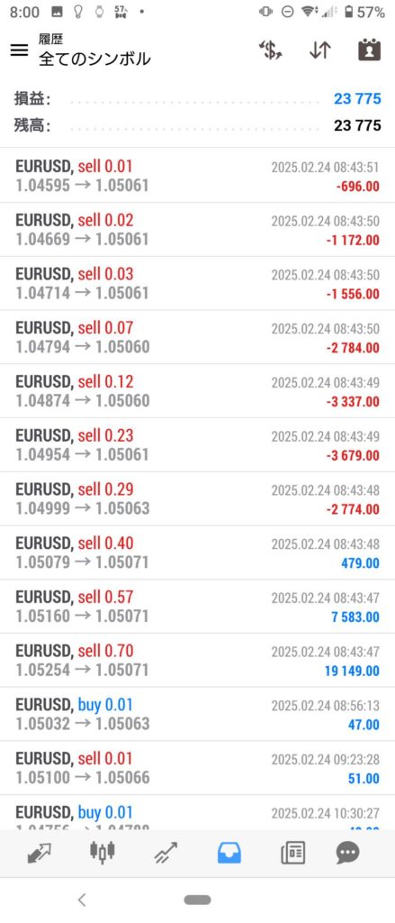 THOR EA 2/24~2/28 FX自動売買結果+23,775円 2025 3/01 運用結果 2025-03-01 ソーは無料EAとしてプレゼントしています!ご希望の方は【ソーEA希望】とメッセージ下さい! THOR EAの詳細ページ 稼働条件 スタンダード口座版:最低証拠金25万円 マイクロ口座版:証拠金5万円 THORは通貨ペアEURUSDのみ FX業者はXM・IS6(EX口座可)・IronFX・HFMを使用します。 目次THOR EA 週間利益結果 結果 +23,775円 関連 運用結果 運用結果 よかったらシェアしてね! URLをコピーしました! URLをコピーしました! HULK改 EA 2/24~2/28 FX自動売買結果+13,109円 THOR Limit EA 2/24~2/28 FX自動売買結果+21,211円 関連記事 BOLTS EA 1/26~1/30 FX自動売買結果+212円 2026-01-31 FRIDAY EA 1/26~1/30 FX自動売買結果+1,538円 2026-01-31 SHIELD EA 1/26~1/30 FX自動売買結果+210,444円 2026-01-31 ETERNAL EA 1/26~1/30 FX自動売買結果+474,591円 2026-01-31 SWORD EA 1/26~1/30 FX自動売買結果+341,560円 2026-01-31 STAR EA 1/26~1/30 FX自動売買結果+329,665円 2026-01-31 朝活トレード!Buster EA 1/26~1/30 FX自動売買結果 2026-01-31 Guardian NEO 1/26~1/30 FX自動売買結果+101,661円 2026-01-31
