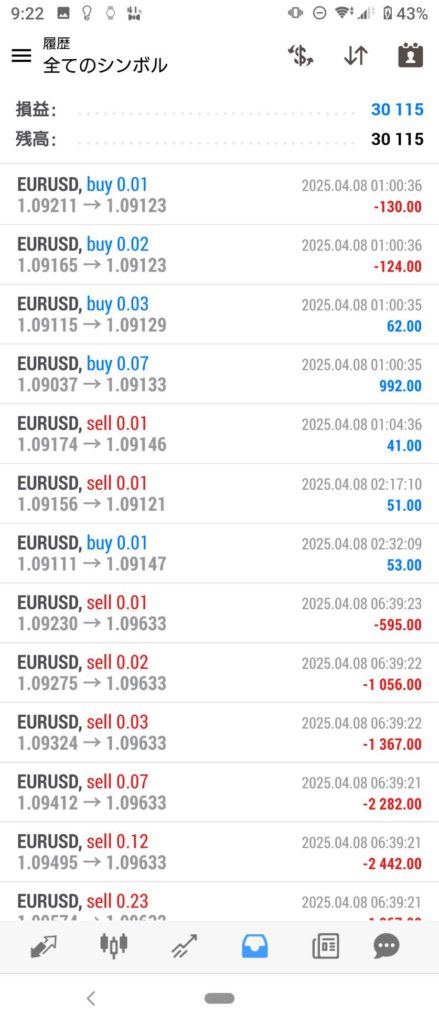 THOR EA 4/7~4/11 FX自動売買結果+30,115円 2025 4/12 運用結果 2025-04-12 ソーは無料EAとしてプレゼントしています!ご希望の方は【ソーEA希望】とメッセージ下さい! THOR EAの詳細ページ 稼働条件 スタンダード口座版:最低証拠金25万円 マイクロ口座版:証拠金5万円 THORは通貨ペアEURUSDのみ FX業者はXM・IS6(EX口座可)・IronFX・HFMを使用します。 目次THOR EA 週間利益結果 結果 +30,115円 関連 運用結果 運用結果 よかったらシェアしてね! URLをコピーしました! URLをコピーしました! HULK改 EA 4/7~4/11 FX自動売買結果+36,563円 Ant EA 4/7~4/11 FX自動売買結果+250,850円 関連記事 BOLTS EA 1/26~1/30 FX自動売買結果+212円 2026-01-31 FRIDAY EA 1/26~1/30 FX自動売買結果+1,538円 2026-01-31 SHIELD EA 1/26~1/30 FX自動売買結果+210,444円 2026-01-31 ETERNAL EA 1/26~1/30 FX自動売買結果+474,591円 2026-01-31 SWORD EA 1/26~1/30 FX自動売買結果+341,560円 2026-01-31 STAR EA 1/26~1/30 FX自動売買結果+329,665円 2026-01-31 朝活トレード!Buster EA 1/26~1/30 FX自動売買結果 2026-01-31 Guardian NEO 1/26~1/30 FX自動売買結果+101,661円 2026-01-31