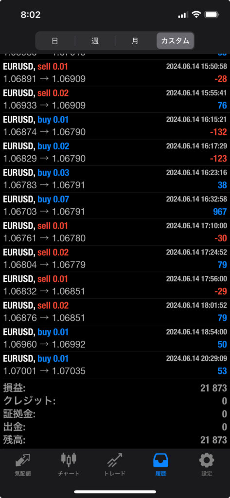 THOR EA 6/10~6/14 FX自動売買結果+21,873円 2024 6/15 運用結果 2024-06-15 ソーは無料EAとしてプレゼントしています!ご希望の方は【ソーEA希望】とメッセージ下さい! THOR EAの詳細ページ 稼働条件 スタンダード口座版:最低証拠金25万円 マイクロ口座版:証拠金5万円 THORは通貨ペアEURUSDのみ FX業者はXM・IS6(EX口座可)・IronFX・HFMを使用します。 目次THOR EA 週間利益結果 結果 +21,873円 関連 運用結果 運用結果 よかったらシェアしてね! URLをコピーしました! URLをコピーしました! HULK EA改 6/10~6/14 FX自動売買結果+12,840円 THOR Limit EA 6/10~6/14 FX自動売買結果+11,692円 関連記事 BOLTS EA 1/26~1/30 FX自動売買結果+212円 2026-01-31 FRIDAY EA 1/26~1/30 FX自動売買結果+1,538円 2026-01-31 SHIELD EA 1/26~1/30 FX自動売買結果+210,444円 2026-01-31 ETERNAL EA 1/26~1/30 FX自動売買結果+474,591円 2026-01-31 SWORD EA 1/26~1/30 FX自動売買結果+341,560円 2026-01-31 STAR EA 1/26~1/30 FX自動売買結果+329,665円 2026-01-31 朝活トレード!Buster EA 1/26~1/30 FX自動売買結果 2026-01-31 Guardian NEO 1/26~1/30 FX自動売買結果+101,661円 2026-01-31