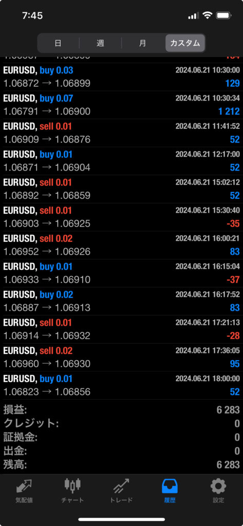 THOR EA 6/17~6/21 FX自動売買結果+6,283円 2024 6/22 運用結果 2024-06-22 ソーは無料EAとしてプレゼントしています!ご希望の方は【ソーEA希望】とメッセージ下さい! THOR EAの詳細ページ 稼働条件 スタンダード口座版:最低証拠金25万円 マイクロ口座版:証拠金5万円 THORは通貨ペアEURUSDのみ FX業者はXM・IS6(EX口座可)・IronFX・HFMを使用します。 目次THOR EA 週間利益結果 結果 +6,283円 関連 運用結果 運用結果 よかったらシェアしてね! URLをコピーしました! URLをコピーしました! HULK EA改 6/17~6/21 FX自動売買結果+5,435円 THOR Limit EA 6/17~6/21 FX自動売買結果+11,321円 関連記事 BOLTS EA 1/26~1/30 FX自動売買結果+212円 2026-01-31 FRIDAY EA 1/26~1/30 FX自動売買結果+1,538円 2026-01-31 SHIELD EA 1/26~1/30 FX自動売買結果+210,444円 2026-01-31 ETERNAL EA 1/26~1/30 FX自動売買結果+474,591円 2026-01-31 SWORD EA 1/26~1/30 FX自動売買結果+341,560円 2026-01-31 STAR EA 1/26~1/30 FX自動売買結果+329,665円 2026-01-31 朝活トレード!Buster EA 1/26~1/30 FX自動売買結果 2026-01-31 Guardian NEO 1/26~1/30 FX自動売買結果+101,661円 2026-01-31