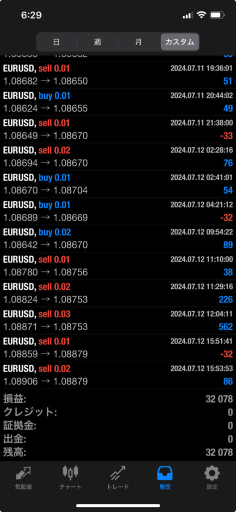 THOR EA 7/8~7/12 FX自動売買結果+32,078円 2024 7/13 運用結果 2024-07-13 ソーは無料EAとしてプレゼントしています!ご希望の方は【ソーEA希望】とメッセージ下さい! THOR EAの詳細ページ 稼働条件 スタンダード口座版:最低証拠金25万円 マイクロ口座版:証拠金5万円 THORは通貨ペアEURUSDのみ FX業者はXM・IS6(EX口座可)・IronFX・HFMを使用します。 目次THOR EA 週間利益結果 結果 +32,078円 関連 運用結果 運用結果 よかったらシェアしてね! URLをコピーしました! URLをコピーしました! HULK EA改 7/8~7/12 FX自動売買結果+16,596円 THOR Limit EA 7/8~7/12 FX自動売買結果+18,631円 関連記事 BOLTS EA 1/26~1/30 FX自動売買結果+212円 2026-01-31 FRIDAY EA 1/26~1/30 FX自動売買結果+1,538円 2026-01-31 SHIELD EA 1/26~1/30 FX自動売買結果+210,444円 2026-01-31 ETERNAL EA 1/26~1/30 FX自動売買結果+474,591円 2026-01-31 SWORD EA 1/26~1/30 FX自動売買結果+341,560円 2026-01-31 STAR EA 1/26~1/30 FX自動売買結果+329,665円 2026-01-31 朝活トレード!Buster EA 1/26~1/30 FX自動売買結果 2026-01-31 Guardian NEO 1/26~1/30 FX自動売買結果+101,661円 2026-01-31