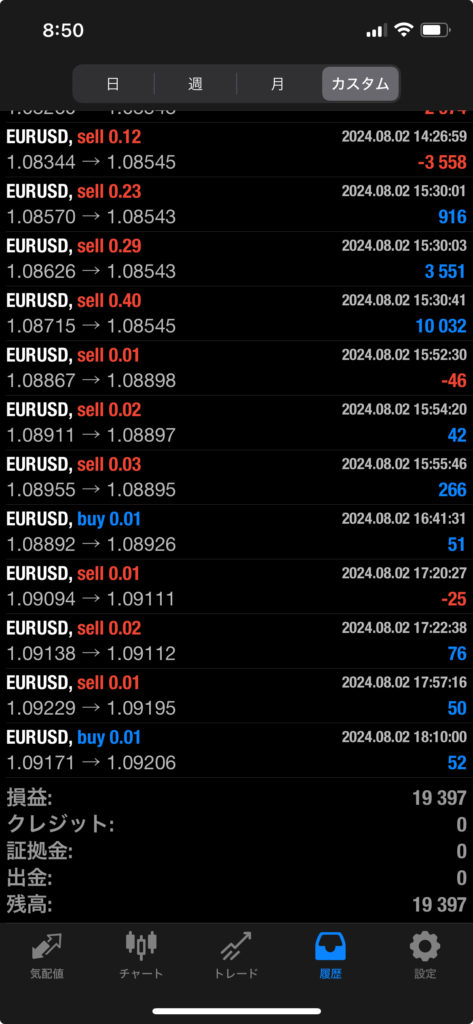 THOR EA 7/29~8/2 FX自動売買結果+19,397円 2024 8/03 運用結果 2024-08-03 ソーは無料EAとしてプレゼントしています!ご希望の方は【ソーEA希望】とメッセージ下さい! THOR EAの詳細ページ 稼働条件 スタンダード口座版:最低証拠金25万円 マイクロ口座版:証拠金5万円 THORは通貨ペアEURUSDのみ FX業者はXM・IS6(EX口座可)・IronFX・HFMを使用します。 目次THOR EA 週間利益結果 結果 +19,397円 関連 運用結果 運用結果 よかったらシェアしてね! URLをコピーしました! URLをコピーしました! HULK EA改 7/29~8/2 FX自動売買結果+20,660円 THOR Limit EA 7/29~8/2 FX自動売買結果+20,114円 関連記事 放置型EA SPIDER 3/16~3/20 FX自動売買結果-34,137円 2026-03-21 放置型EA BOLTS 3/16~3/20 FX自動売買結果+8,495円 2026-03-21 放置型EA FRIDAY 3/16~3/20 FX自動売買結果+11,483円 2026-03-21 SHIELD EA 3/16~3/20 FX自動売買結果+63,204円 2026-03-21 ETERNAL EA 3/16~3/20 FX自動売買結果+467,490円 2026-03-21 SWORD EA 3/16~3/20 FX自動売買結果+725,515円 2026-03-21 STAR EA 3/16~3/20 FX自動売買結果+3,183円 2026-03-21 Guardian NEO 3/16~3/20 FX自動売買結果+72,888円 2026-03-21