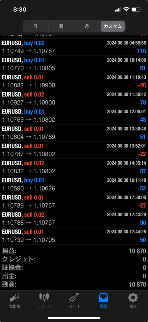 THOR EA 8/26~8/30 FX自動売買結果+10,870円 2024 8/31 運用結果 2024-08-31 ソーは無料EAとしてプレゼントしています!ご希望の方は【ソーEA希望】とメッセージ下さい! THOR EAの詳細ページ 稼働条件 スタンダード口座版:最低証拠金25万円 マイクロ口座版:証拠金5万円 THORは通貨ペアEURUSDのみ FX業者はXM・IS6(EX口座可)・IronFX・HFMを使用します。 目次THOR EA 週間利益結果 結果 +10,870円 関連 運用結果 運用結果 よかったらシェアしてね! URLをコピーしました! URLをコピーしました! HULK改 EA 8/26~8/30 FX自動売買結果+7,322円 THOR Limit EA 8/26~8/30 FX自動売買結果+12,331円 関連記事 BOLTS EA 1/26~1/30 FX自動売買結果+212円 2026-01-31 FRIDAY EA 1/26~1/30 FX自動売買結果+1,538円 2026-01-31 SHIELD EA 1/26~1/30 FX自動売買結果+210,444円 2026-01-31 ETERNAL EA 1/26~1/30 FX自動売買結果+474,591円 2026-01-31 SWORD EA 1/26~1/30 FX自動売買結果+341,560円 2026-01-31 STAR EA 1/26~1/30 FX自動売買結果+329,665円 2026-01-31 朝活トレード!Buster EA 1/26~1/30 FX自動売買結果 2026-01-31 Guardian NEO 1/26~1/30 FX自動売買結果+101,661円 2026-01-31