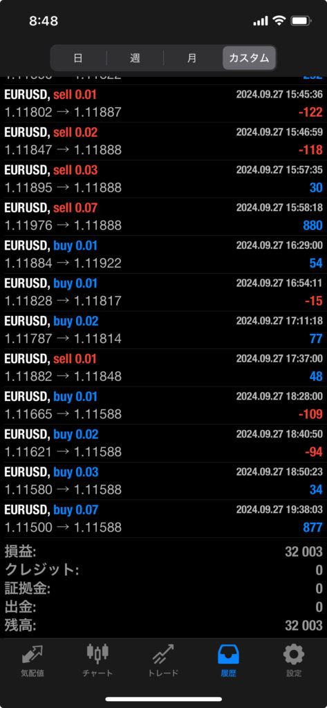 THOR EA 9/23~9/27 FX自動売買結果+32,003円 2024 9/28 運用結果 2024-09-28 ソーは無料EAとしてプレゼントしています!ご希望の方は【ソーEA希望】とメッセージ下さい! THOR EAの詳細ページ 稼働条件 スタンダード口座版:最低証拠金25万円 マイクロ口座版:証拠金5万円 THORは通貨ペアEURUSDのみ FX業者はXM・IS6(EX口座可)・IronFX・HFMを使用します。 目次THOR EA 週間利益結果 結果 +32,003円 関連 運用結果 運用結果 よかったらシェアしてね! URLをコピーしました! URLをコピーしました! HULK改 EA 9/23~9/27 FX自動売買結果+16,697円 THOR Limit EA 9/23~9/27 FX自動売買結果+10,407円 関連記事 BOLTS EA 1/26~1/30 FX自動売買結果+212円 2026-01-31 FRIDAY EA 1/26~1/30 FX自動売買結果+1,538円 2026-01-31 SHIELD EA 1/26~1/30 FX自動売買結果+210,444円 2026-01-31 ETERNAL EA 1/26~1/30 FX自動売買結果+474,591円 2026-01-31 SWORD EA 1/26~1/30 FX自動売買結果+341,560円 2026-01-31 STAR EA 1/26~1/30 FX自動売買結果+329,665円 2026-01-31 朝活トレード!Buster EA 1/26~1/30 FX自動売買結果 2026-01-31 Guardian NEO 1/26~1/30 FX自動売買結果+101,661円 2026-01-31