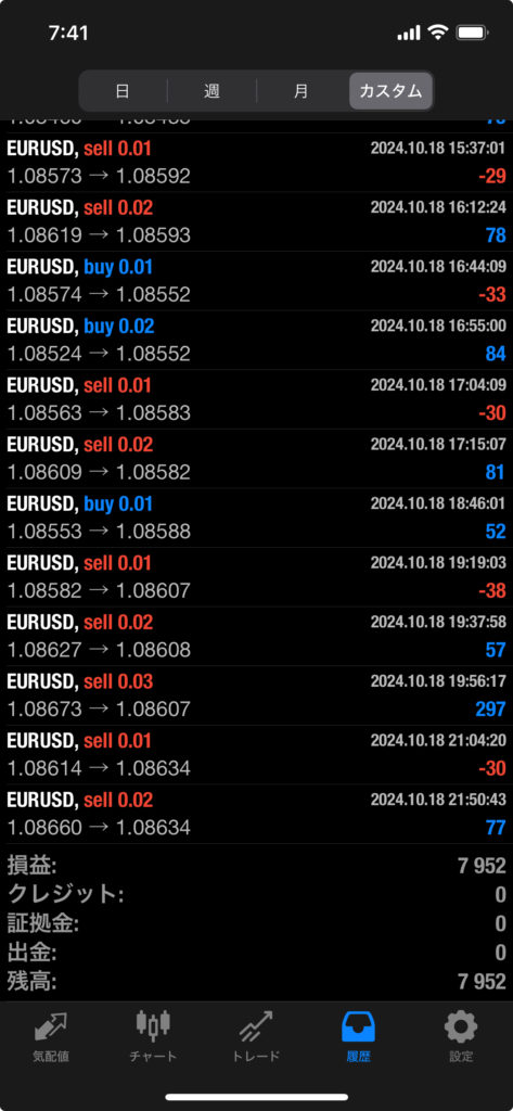 THOR EA 10/14~10/18 FX自動売買結果+7,952円 2024 10/19 運用結果 2024-10-19 ソーは無料EAとしてプレゼントしています!ご希望の方は【ソーEA希望】とメッセージ下さい! THOR EAの詳細ページ 稼働条件 スタンダード口座版:最低証拠金25万円 マイクロ口座版:証拠金5万円 THORは通貨ペアEURUSDのみ FX業者はXM・IS6(EX口座可)・IronFX・HFMを使用します。 目次THOR EA 週間利益結果 結果 +7,952円 関連 運用結果 運用結果 よかったらシェアしてね! URLをコピーしました! URLをコピーしました! HULK改 EA 10/14~10/18 FX自動売買結果+6,381円 THOR Limit EA 10/14~10/18 FX自動売買結果+5,652円 関連記事 BOLTS EA 1/26~1/30 FX自動売買結果+212円 2026-01-31 FRIDAY EA 1/26~1/30 FX自動売買結果+1,538円 2026-01-31 SHIELD EA 1/26~1/30 FX自動売買結果+210,444円 2026-01-31 ETERNAL EA 1/26~1/30 FX自動売買結果+474,591円 2026-01-31 SWORD EA 1/26~1/30 FX自動売買結果+341,560円 2026-01-31 STAR EA 1/26~1/30 FX自動売買結果+329,665円 2026-01-31 朝活トレード!Buster EA 1/26~1/30 FX自動売買結果 2026-01-31 Guardian NEO 1/26~1/30 FX自動売買結果+101,661円 2026-01-31