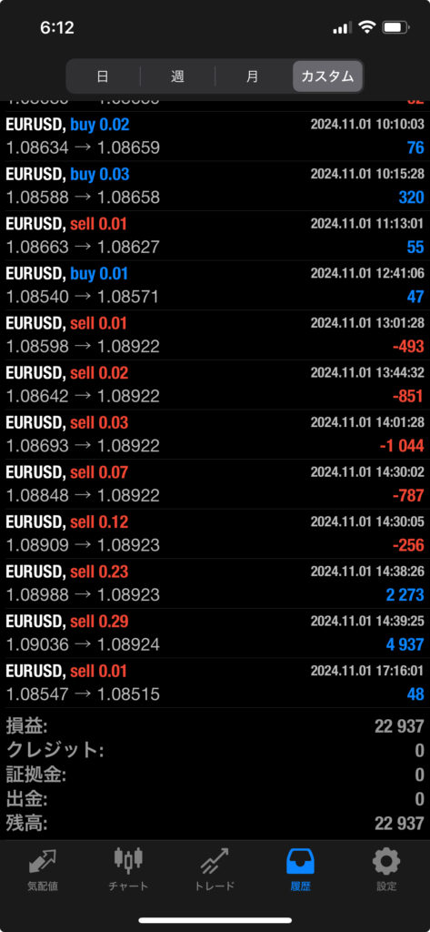 THOR EA 10/28~11/1 FX自動売買結果+22,937円 2024 11/02 運用結果 2024-11-02 ソーは無料EAとしてプレゼントしています!ご希望の方は【ソーEA希望】とメッセージ下さい! THOR EAの詳細ページ 稼働条件 スタンダード口座版:最低証拠金25万円 マイクロ口座版:証拠金5万円 THORは通貨ペアEURUSDのみ FX業者はXM・IS6(EX口座可)・IronFX・HFMを使用します。 目次THOR EA 週間利益結果 結果 +22,937円 関連 運用結果 運用結果 よかったらシェアしてね! URLをコピーしました! URLをコピーしました! HULK改 EA 10/28~11/1 FX自動売買結果+11,900円 THOR Limit EA 10/28~11/1 FX自動売買結果+21,750円 関連記事 BOLTS EA 1/26~1/30 FX自動売買結果+212円 2026-01-31 FRIDAY EA 1/26~1/30 FX自動売買結果+1,538円 2026-01-31 SHIELD EA 1/26~1/30 FX自動売買結果+210,444円 2026-01-31 ETERNAL EA 1/26~1/30 FX自動売買結果+474,591円 2026-01-31 SWORD EA 1/26~1/30 FX自動売買結果+341,560円 2026-01-31 STAR EA 1/26~1/30 FX自動売買結果+329,665円 2026-01-31 朝活トレード!Buster EA 1/26~1/30 FX自動売買結果 2026-01-31 Guardian NEO 1/26~1/30 FX自動売買結果+101,661円 2026-01-31