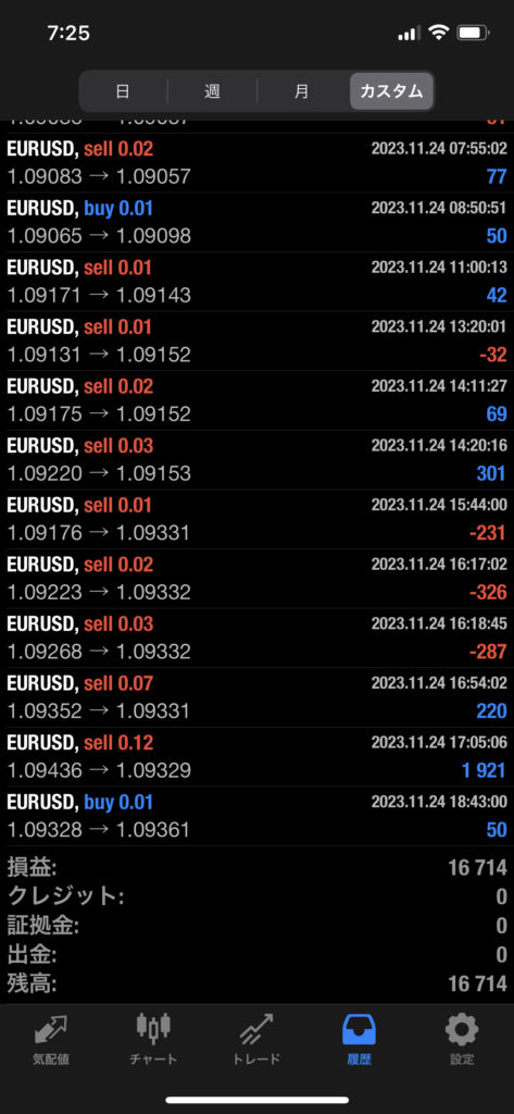 THOR EA 11/20~11/24 FX自動売買結果+16,714円 2023 11/25 運用結果 2023-11-25 ソーは無料EAとしてプレゼントしています!ご希望の方は【ソーEA希望】とメッセージ下さい! THOR EAの詳細ページ 稼働条件 スタンダード口座版:最低証拠金25万円 マイクロ口座版:証拠金5万円 入金ボーナス付与可能(お気軽にご相談ください) THORは通貨ペアEURUSDのみ FX業者はXM・IS6(EX口座可)・IronFX・HFMを使用します。 目次THOR EA 週間利益結果 結果 +16,714円 関連 運用結果 運用結果 よかったらシェアしてね! URLをコピーしました! URLをコピーしました! HULK EA改 11/20~11/24 FX自動売買結果+9,475円 THOR Limit EA 11/20~11/24 FX自動売買結果+25,980円 関連記事 BOLTS EA 1/26~1/30 FX自動売買結果+212円 2026-01-31 FRIDAY EA 1/26~1/30 FX自動売買結果+1,538円 2026-01-31 SHIELD EA 1/26~1/30 FX自動売買結果+210,444円 2026-01-31 ETERNAL EA 1/26~1/30 FX自動売買結果+474,591円 2026-01-31 SWORD EA 1/26~1/30 FX自動売買結果+341,560円 2026-01-31 STAR EA 1/26~1/30 FX自動売買結果+329,665円 2026-01-31 朝活トレード!Buster EA 1/26~1/30 FX自動売買結果 2026-01-31 Guardian NEO 1/26~1/30 FX自動売買結果+101,661円 2026-01-31