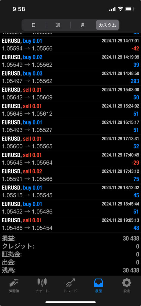 THOR EA 11/25~11/29 FX自動売買結果+30,438円 2024 11/30 運用結果 2024-11-30 ソーは無料EAとしてプレゼントしています!ご希望の方は【ソーEA希望】とメッセージ下さい! THOR EAの詳細ページ 稼働条件 スタンダード口座版:最低証拠金25万円 マイクロ口座版:証拠金5万円 THORは通貨ペアEURUSDのみ FX業者はXM・IS6(EX口座可)・IronFX・HFMを使用します。 目次THOR EA 週間利益結果 結果 +30,438円 関連 運用結果 運用結果 よかったらシェアしてね! URLをコピーしました! URLをコピーしました! HULK改 EA 11/25~11/29 FX自動売買結果+13,834円 THOR Limit EA 11/25~11/29 FX自動売買結果+24,427円 関連記事 BOLTS EA 1/26~1/30 FX自動売買結果+212円 2026-01-31 FRIDAY EA 1/26~1/30 FX自動売買結果+1,538円 2026-01-31 SHIELD EA 1/26~1/30 FX自動売買結果+210,444円 2026-01-31 ETERNAL EA 1/26~1/30 FX自動売買結果+474,591円 2026-01-31 SWORD EA 1/26~1/30 FX自動売買結果+341,560円 2026-01-31 STAR EA 1/26~1/30 FX自動売買結果+329,665円 2026-01-31 朝活トレード!Buster EA 1/26~1/30 FX自動売買結果 2026-01-31 Guardian NEO 1/26~1/30 FX自動売買結果+101,661円 2026-01-31