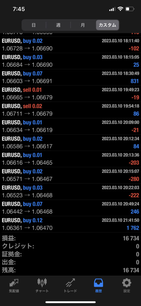 THOR EA 3/6~3/10 FX自動売買結果+16,734円 2023 3/11 運用結果 2023-03-11 ソーは無料EAとしてプレゼントしています!ご希望の方は【ソーEA希望】とメッセージ下さい! THOR EAの詳細ページ 稼働条件 証拠金25万円(入金ボーナス100%がつきます) THORは通貨ペアEURUSDのみ FX業者はFXFair・XM・Exnessを使用します。 目次THOR EA 週間利益結果 結果 +16,734円 初期元本50万円(入金25万円+ボーナス25万円)で運用スタート 関連 運用結果 運用結果 よかったらシェアしてね! URLをコピーしました! URLをコピーしました! HULK EA改 3/6~3/10 FX自動売買結果+6,032円 THOR Limit EA 3/6~3/10 FX自動売買結果+26,702円 関連記事 BOLTS EA 1/26~1/30 FX自動売買結果+212円 2026-01-31 FRIDAY EA 1/26~1/30 FX自動売買結果+1,538円 2026-01-31 SHIELD EA 1/26~1/30 FX自動売買結果+210,444円 2026-01-31 ETERNAL EA 1/26~1/30 FX自動売買結果+474,591円 2026-01-31 SWORD EA 1/26~1/30 FX自動売買結果+341,560円 2026-01-31 STAR EA 1/26~1/30 FX自動売買結果+329,665円 2026-01-31 朝活トレード!Buster EA 1/26~1/30 FX自動売買結果 2026-01-31 Guardian NEO 1/26~1/30 FX自動売買結果+101,661円 2026-01-31