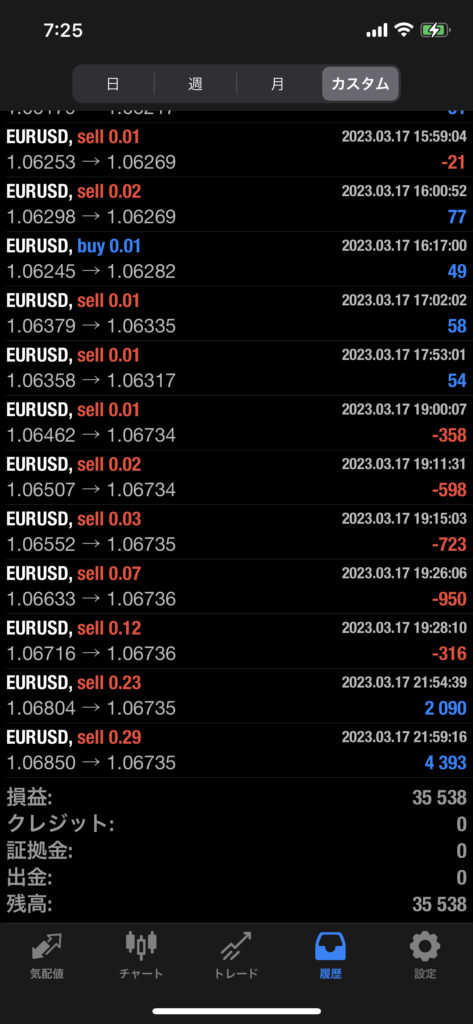 THOR EA 3/13~3/17 FX自動売買結果+35,538円 2023 3/18 運用結果 2023-03-18 ソーは無料EAとしてプレゼントしています!ご希望の方は【ソーEA希望】とメッセージ下さい! THOR EAの詳細ページ 稼働条件 証拠金25万円(入金ボーナス100%がつきます) THORは通貨ペアEURUSDのみ FX業者はFXFair・XM・Exnessを使用します。 目次THOR EA 週間利益結果 結果 +35,538円 初期元本50万円(入金25万円+ボーナス25万円)で運用スタート 関連 運用結果 運用結果 よかったらシェアしてね! URLをコピーしました! URLをコピーしました! HULK EA改 3/13~3/17 FX自動売買結果+62,210円 THOR Limit EA 3/13~3/17 FX自動売買結果+35,004円 関連記事 BOLTS EA 1/26~1/30 FX自動売買結果+212円 2026-01-31 FRIDAY EA 1/26~1/30 FX自動売買結果+1,538円 2026-01-31 SHIELD EA 1/26~1/30 FX自動売買結果+210,444円 2026-01-31 ETERNAL EA 1/26~1/30 FX自動売買結果+474,591円 2026-01-31 SWORD EA 1/26~1/30 FX自動売買結果+341,560円 2026-01-31 STAR EA 1/26~1/30 FX自動売買結果+329,665円 2026-01-31 朝活トレード!Buster EA 1/26~1/30 FX自動売買結果 2026-01-31 Guardian NEO 1/26~1/30 FX自動売買結果+101,661円 2026-01-31